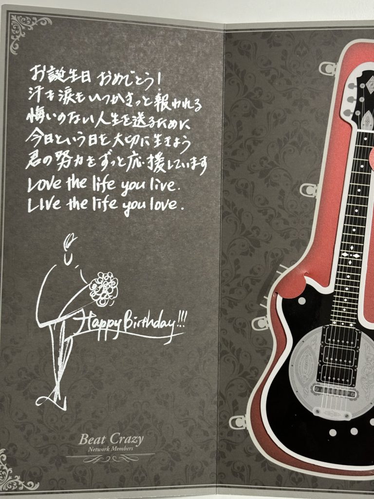 このバースデーカードに、布袋からのメッセージが添えられています。メッセージは「今年はこのメッセージでいこう」と布袋が考え、心にしみる内容です。今年はどんなメッセージか?メッセージカードを開ける瞬間のワクワク感がたまりません。
